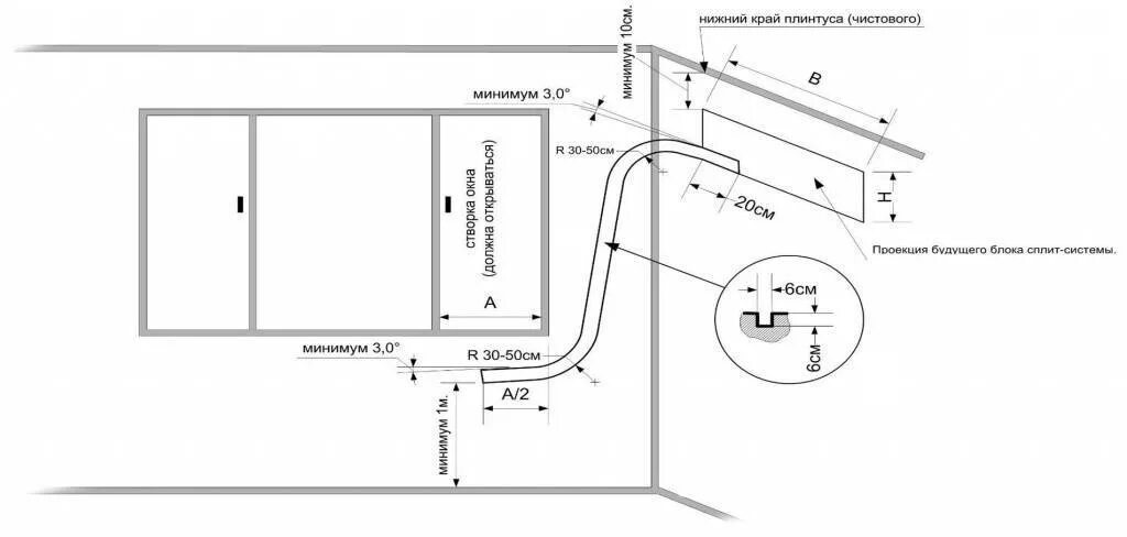 Дренажный шланг прокладывают с уклоном 1 см на 1 м длины, чтобы конденсат свободно стекал наружу. Если дренаж выводится в канализацию, вывод на улицу не требуется. При невозможности прокладки под естественным уклоном используют дренажные помпы